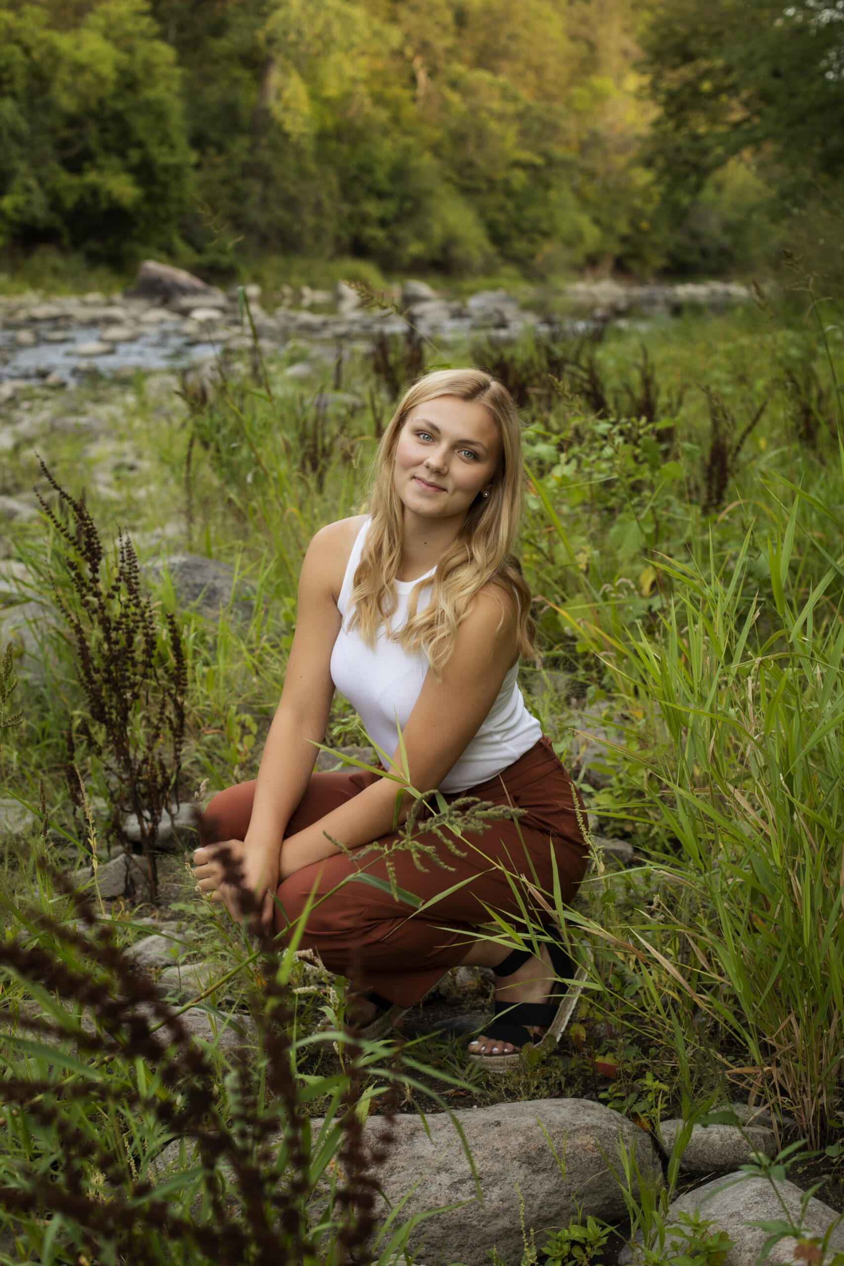 A picture of a girl with short blonde hair wearing a burnt orange turtleneck sweater in front of green scenery.